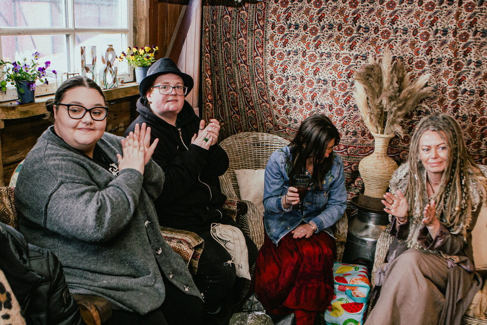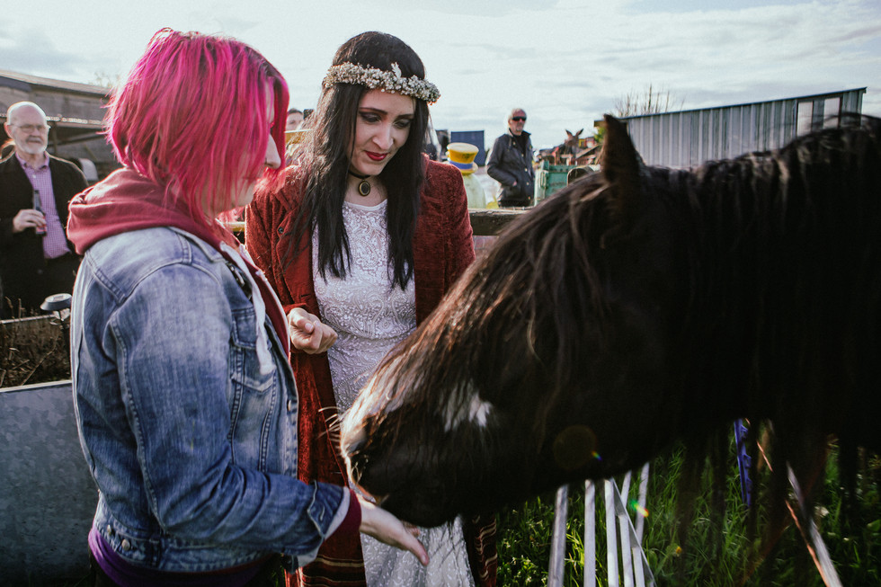 ‘We can’t get everyone in the Town Hall ceremony as they’re strict as fuck on the numbers but once the legal bollocks has finished we’ll be heading to Bill and Emilys for the hippy shit so bring a sarnie and a brolly. Handfast, surrounded by lambs and goats, then cake. Then tractor driving lessons, pet some donkeys, fish and chips then everyone needs to go cause we have to bugger off the campsite by 10 in the morning’.