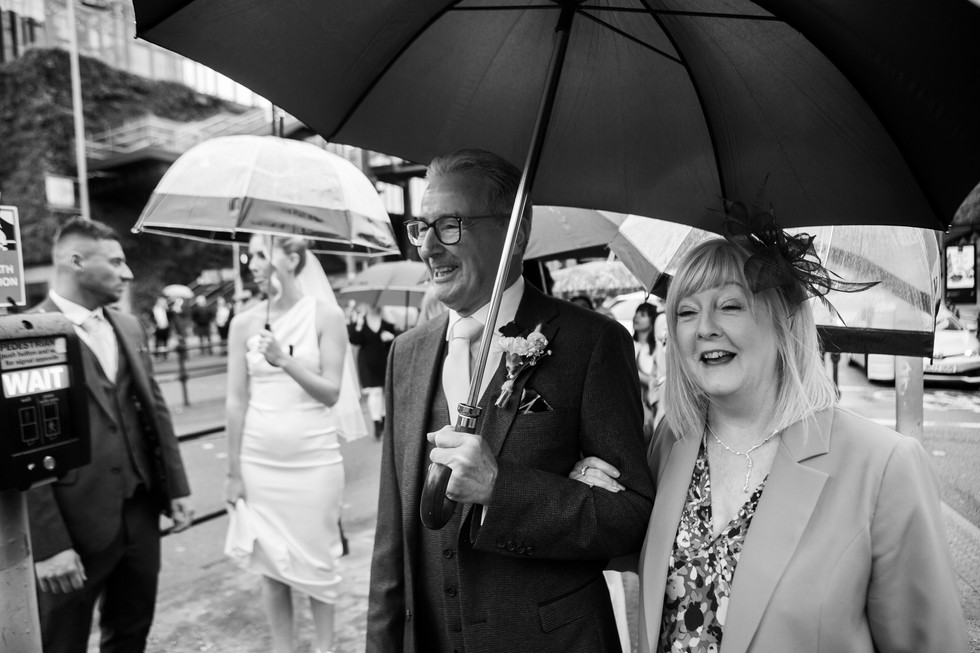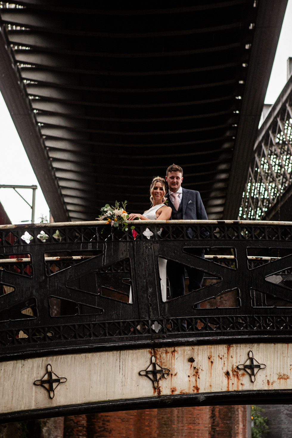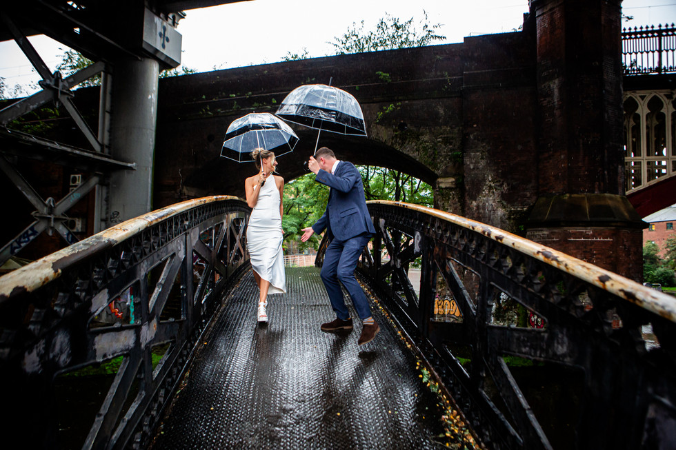 With the help of a wedding guest, a delightful fellow who hadn’t actually met Lorna or Rob, but handled an umbrella like no-one I've seen before, we ventured out and found some shelter from the rain under the bridges of Manchesters canal network for a photo session with the new Mr and Mrs Willcock.